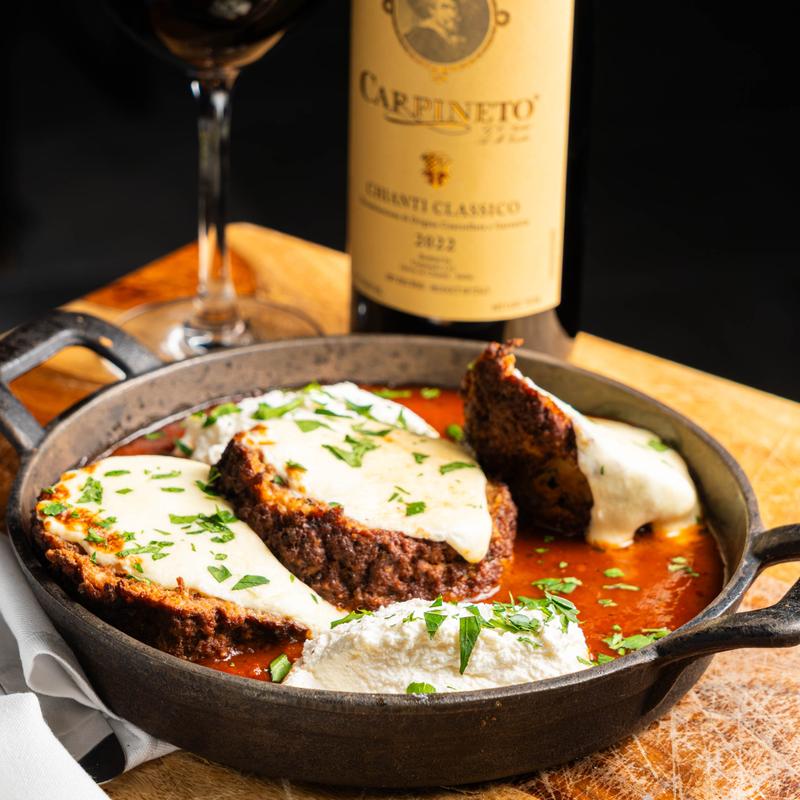 $18.00 | $18.71 • Crispy eggplant stack, roasted tomatoes, ricotta, mozzarella, marinara, parmigiano